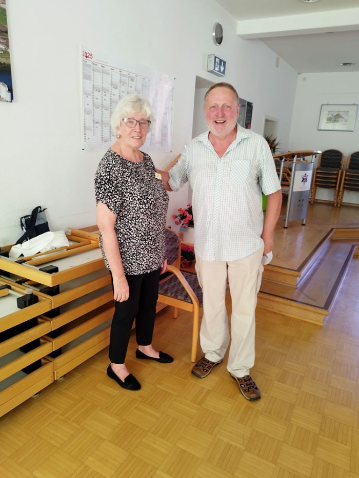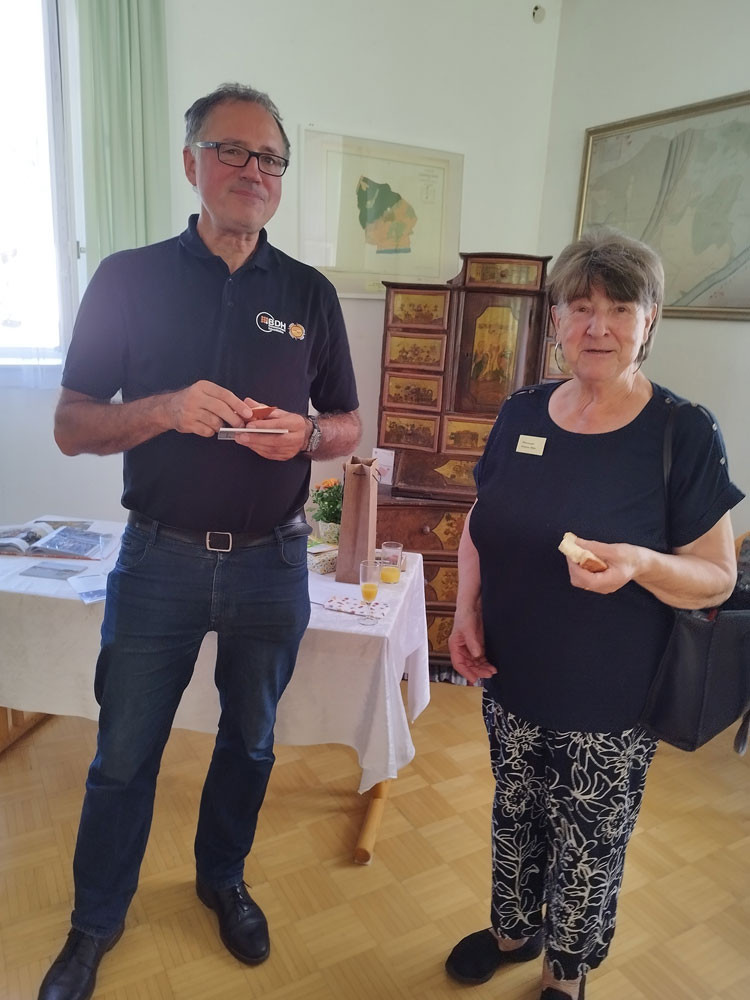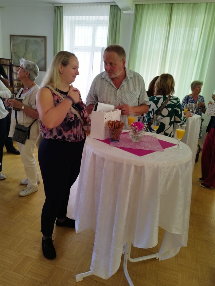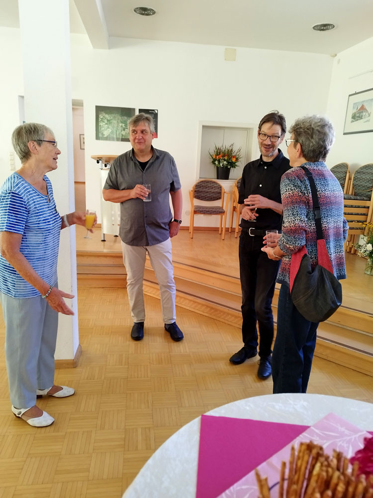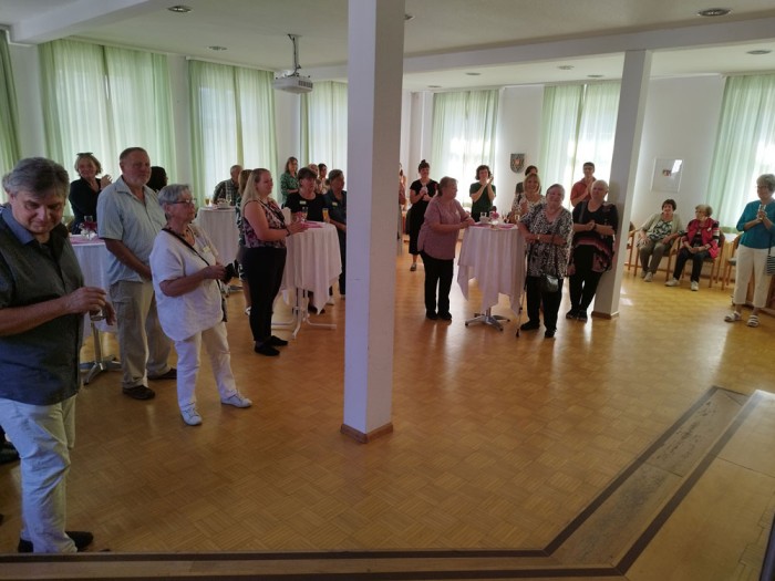 Eine kleine, feine Jubiläumsfeier konnten wir im Sitzungssaal der Ortsverwaltung in Herten erleben. Am Vormittag hatten wir zu einem Sektempfang mit Speckgugelhupf und Hefezopf geladen. Das Spieldorf Herten sorgte für die Bewirtung der Gäste. In freundschaftlicher, erspannter Atmosphäre wurden die aktiven und ehemaligen Mitarbeitenden der Pfalzergruppe begrüßt. Zu den Gratulanten gehörten Frau Bürgermeisterin Kristin Fuchs, die uns mit einem persönlichen Geschenk überraschte. Es waren selbstgegossene, hübsch verpackte Engelchen für jeden einen. Unser Ortsvorsteher Matthias Reiske brachte Sonnenblumen mit, so wie auch manche der Gratulanten Blumen mitbrachten, einen Geschenkkorb gab es ebenfalls. Über besondere Geschenke für die Gruppe können wir uns freuen. So dürfen wir eine Rikschafahrt machen, im Cafe Grenzenlos einkehren und uns in der Tüllinger Höhe zu einem Besuch mit Verköstigung einfinden. Es gab einige Ansprachen, die die Dankbarkeit und Wertschätzung für unsere geleistete Arbeit zum Ausdruck brachten. Vor allem diese langjährige Begleitung mit Spenden, auf die sich die einzelnen Gruppierungen bis heute verlassen können, ist ein wertvoller Beitrag für die Menschen in unserer Region.